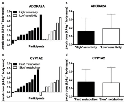 - CYP1A2を調べた2012年の研究では、AAホモ接合体を持つ人は1つ以上のC遺伝子を持つ人よりもタイムトライアルの成績向上が有意に高かった(4.9% vs 1.8%)(R)