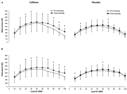 - カフェイン群は10負荷のうち8負荷で平均パワーが増加したのに対して、プラセボ軍では10負荷のうち2負荷でしか有意な群間差を示さなかった
