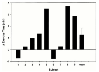 脊椎損傷による下半身麻痺患者9名に6mg/体重のカフェインを摂取してもらい、サイクリングで筋持久力を測定した