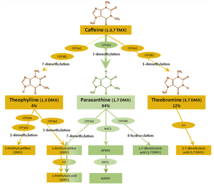 カフェインはテオフィリン・パラキサンチン・テオブロミンなどに代謝されますが、どれもCYP1A2が関わっている。