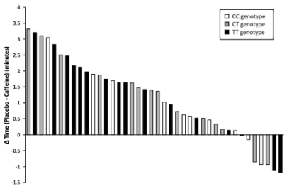 - 2015年の小規模研究では(女性12人)、カフェインはTT遺伝子型の女性グループでは10分間のサイクリングタイムトライアルを有意に改善したが、C対立遺伝子を含む群では改善しなかった(R)