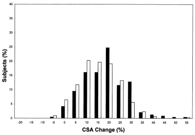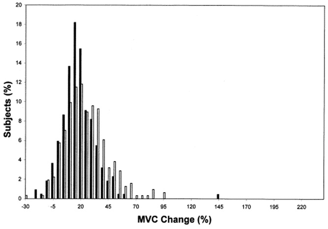 筋肥大率は-2 ~ +59%、筋力増加率は0 ~ +250%まで差があった