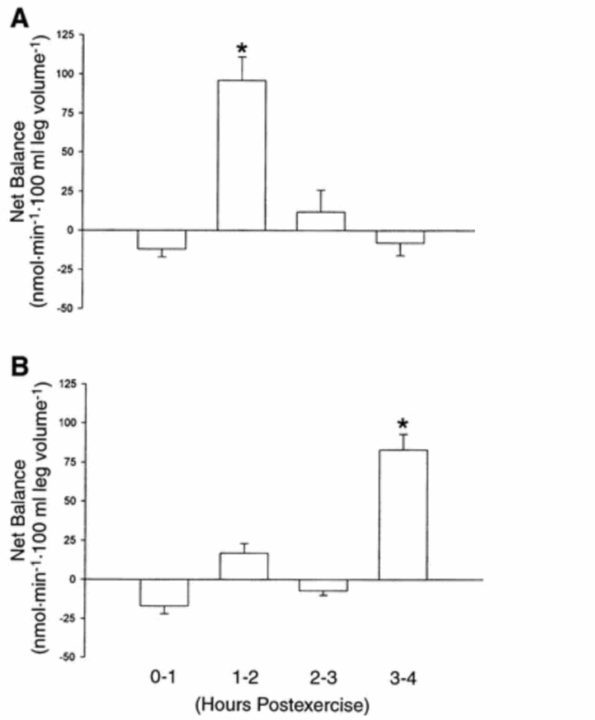 例えば2000年の「運動1時間後vs3時間後で正味のたんぱく質を比較した」研究では、1時間後と3時間後で同じくらい同化に傾いたことが報告されている。(R)
