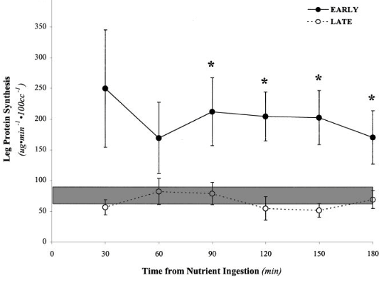 こちらの研究では打って変わって、1時間後の摂取だろうと3時間後の摂取だろうと筋合成のプラス度合いは変わらなかった。