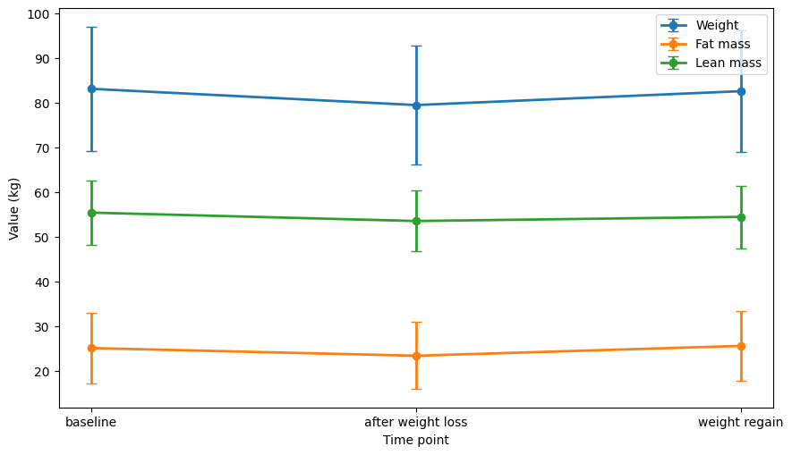 減量期間中は脂肪と筋肉量がどちらも減っている。