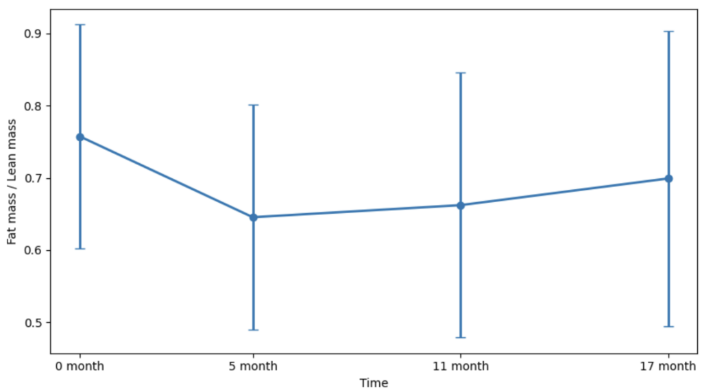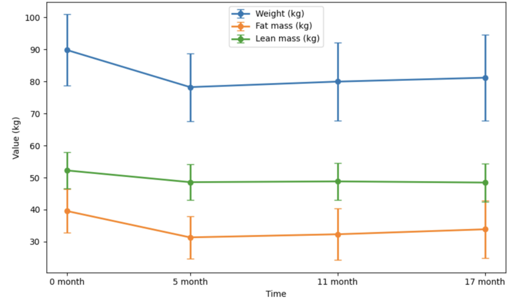 そして5ヶ月目以降のリバウンド期では、筋肉量が横ばいなのに対して、脂肪量は徐々に増加していることがわかる。