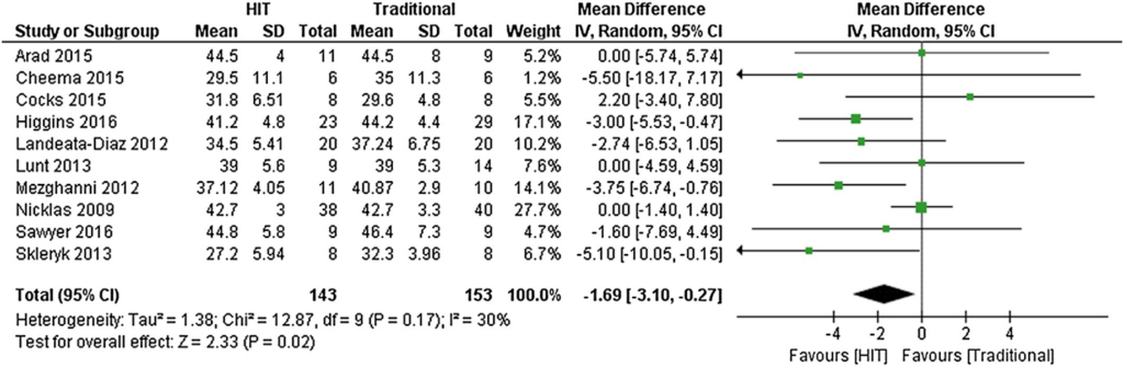 | HIIT | study (n) | participants (n) | MD (IV, Random, 95% CI) | p-value | I2 |
