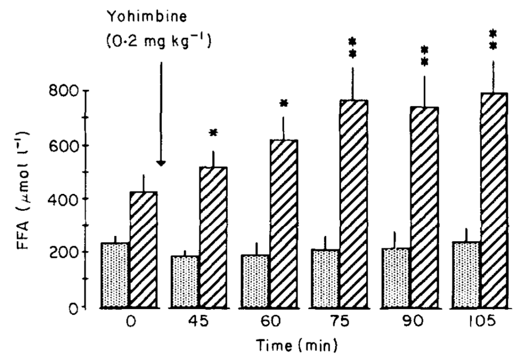 この研究ではヨヒンビンを絶食状態で摂取しているが、実はこれも大事なポイント。